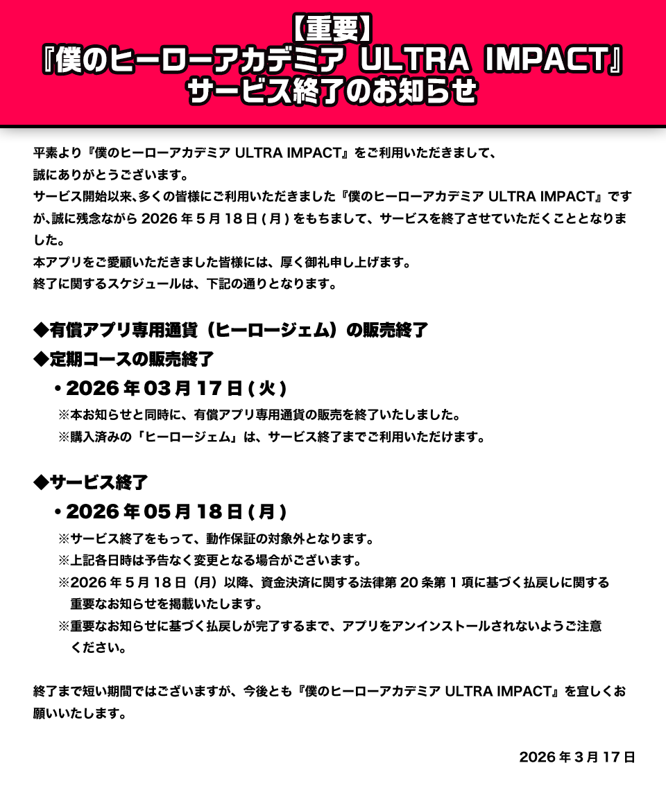 ©堀越耕平/集英社・僕のヒーローアカデミア製作委員会 ©Bandai Namco Entertainment Inc.※画像は開発中のものです。 Apple、Appleのロゴは、米国もしくはその他の国や地域におけるApple Inc.の商標です。 App StoreはApple Inc.のサービスマークです。 Google PlayとGoogle PlayのロゴはGoogle LLCの商標です。